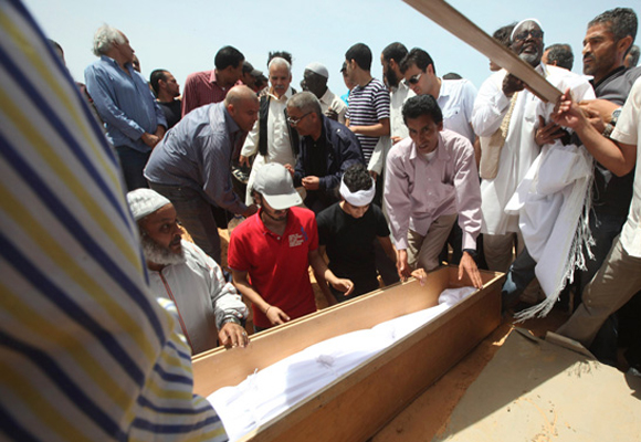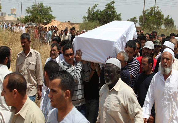Η ταφή του πραγματοποιήθηκε μεταξύ λίγων συγγενών και φίλων σε δυτικό προάστιο της πρωτεύουσας, Τρίπολη, στη Λιβύη. Η σορός του μεταφέρθηκε με ασθενοφόρο στο κοιμητήριο, με δεκάδες ανθρώπους να ακολουθούν το όχημα, λέγοντας προσευχές.