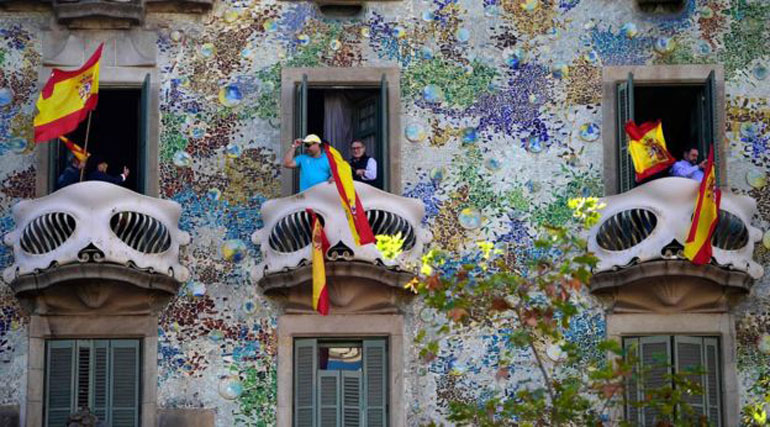 Οι διαδηλωτές κατέκλυσαν την Κυριακή μία από τις εμβληματικές λεωφόρους της Βαρκελώνης, την Πασέιγκ ντε Γκράσια, η οποία γέμισε από ισπανικές σημαίες και όπου ακουγόταν το σύνθημα «Πουτζντεμόν, στη φυλακή», μια αναφορά στον αυτονομιστή Καταλανό ηγέτη, τον οποίο απέπεμψε την Παρασκευή η Μαδρίτη.