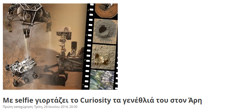 Το «Curiosity» προσγειώθηκε με επιτυχία τον Αύγουστο του 2012 στον κρατήρα «Γκέιλ» και συνεχίζει να στέλνει δεδομένα στη Γη. Αποτελεί τμήμα του προγράμματος «Mars Science Laboratory Mission» (MSL) που στόχο έχει να ρίξει φως στο γεωλογικό παρελθόν του Άρη. Με μέγεθος όσο ένα μικρό αυτοκίνητο, ζυγίζει 889 κιλά και έχει μήκος 2,9 μ. και ύψος 2,2 μ. To διαστημικό ROVER έχει τη δυνατότητα να αναλύει με υπερσύγχρονα όργανα τη χημική σύσταση δειγμάτων, τα οποία συλλέγονται μέσω ρομποτικού βραχίονα από το έδαφος. Τον τελευταίο μήνα εξερευνεί πολυ-επίπεδους γεωλογικούς σχηματισμούς σε μια περιοχή που ονομάζεται «Murray Buttes».