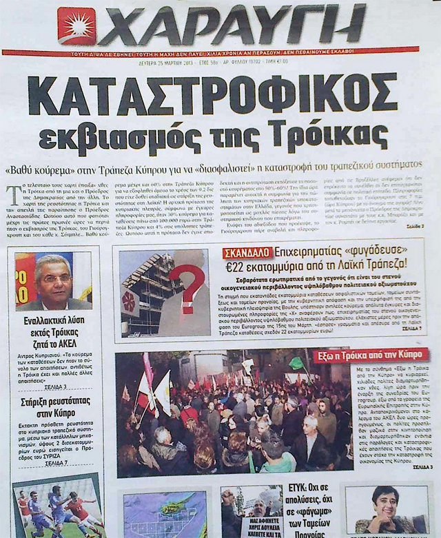 Η «Χαραυγή», υπό τον τίτλο «Καταστροφικός εκβιασμός της Τρόικας», γράφει στο κύριό της θέμα ότι το τελευταίο τους χαρτί έπαιξαν χθες η τρόικα από τη μία και ο Πρόεδρος της Δημοκρατίας από την άλλη, το χαρτί της ρευστότητας η τρόικα και την απειλή της παραίτησης ο Πρόεδρος Αναστασιάδης, και πως αυτό που φαινόταν μέχρι τις πρώτες πρωινές ώρες να περνά ήταν ο εκβιασμός της τρόικας.