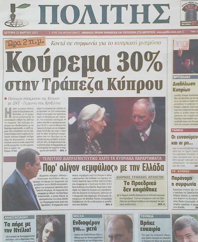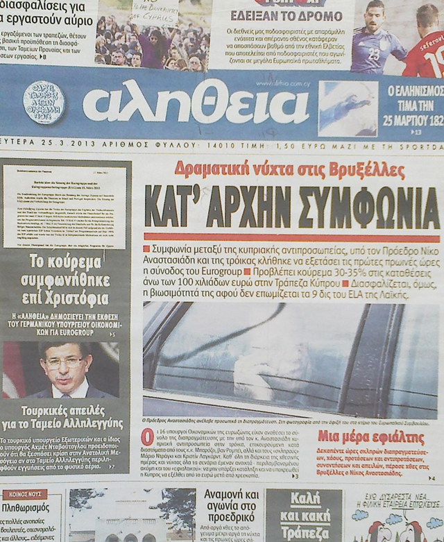 Η «Αλήθεια», υπό τον τίτλο «Κατ’ αρχήν συμφωνία», κάνει λόγο στο κύριό της θέμα για συμφωνία μεταξύ της κυπριακής αντιπροσωπείας υπό τον πρόεδρο Αναστασιάδη και της τρόικας, που κλήθηκε να εξετάσει τις πρώτες πρωινές ώρες η σύνοδος του Eurogroup και η οποία προβλέπει «κούρεμα» 30%-35% στις καταθέσεις άνω των 100 χιλιάδων ευρώ στην Τράπεζα Κύπρου.