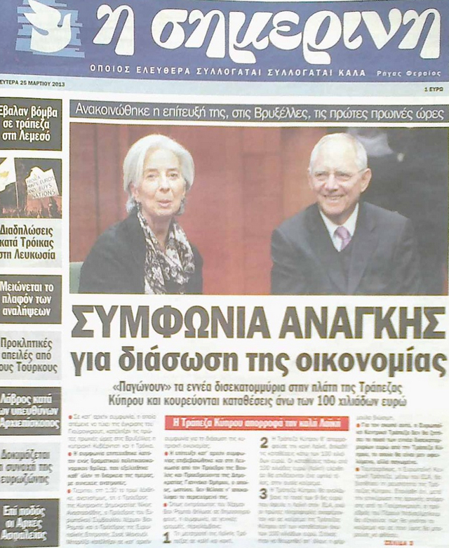 Η «Σημερινή», υπό τον τίτλο «Συμφωνία ανάγκης για διάσωση της οικονομίας», γράφει ότι σε κατ’ αρχήν συμφωνία, η οποία απέμενε να τύχει της έγκρισης του Eurogroup, κατέληξαν τις πρώτες πρωινές ώρες στις Βρυξέλλες η κυπριακή κυβέρνηση και η τρόικα. Αναφέρεται ακόμη στους εορτασμούς για την εθνική επέτειο της 25ης Μαρτίου, η οποία – όπως γράφει – γιορτάζεται στη σκιά της κρίσης. Η εφημερίδα γράφει επίσης για τις χθεσινές διαδηλώσεις κατά της τρόικας στη Λευκωσία.