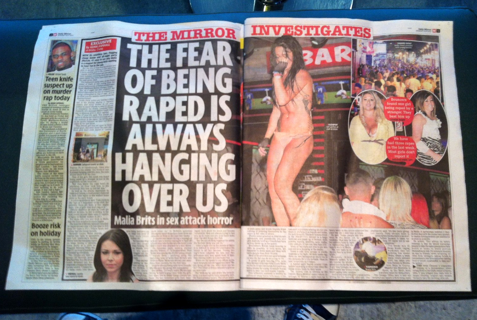 Αυτό είναι το εσωτερικό σαλόνι της Mirror, σύμφωνα με τους πηχιαίους τίτλους του οποίου, ούτε λίγο-ούτε πολύ, τα Μάλια Ηρακλείου είναι το άντρο των βιασμών… Εκείνο που λησμονεί η καλή εφημερίδα να αναφέρει, είναι ότι στο σύνολό τους αυτές οι εγκληματικές πράξεις γίνονται με δράστες τους ίδιους τους Βρετανούς, οι οποίοι, έρχονται στην Ελλάδα «έτοιμοι για όλα», αγνοώντας πλήρως τις σχετικές οδηγίες που κατ’ επανάληψιν έχει εκδόσει και δημοσιοποιήσει το Foreign Office, προκειμένου να συμπεριφέρονται με κάποια -έστω στοιχειώδη- σύνεση…