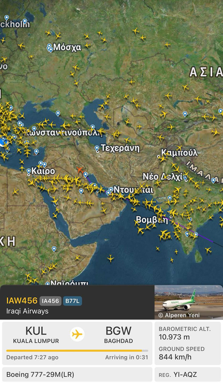 Άδειος από αεροσκάφη παραμένει ωστόσο ο εναέριος χώρος πάνω από το Ιράκ και το Ιράν. Ένα αεροπλάνο των Ιρακινών αερογραμμών (σ.σ με κόκκινο χρώμα) που κατευθύνεται στην Βαγδάτη πραγματοποιεί πτήση όπως φαίνεται στον ακόλουθο χάρτη (ώρα Ελλάδος 9:30 πμ).
