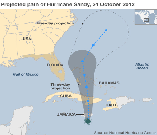Σύμφωνα με το Εθνικό Κέντρο Τυφώνων των Η.Π.Α. η «Sandy» προσέγγισε τις ακτές στο νότιο τμήμα της Τζαμάικα και αναμένεται να κινηθεί προς τον Βορρά, περνώντας από την Αϊτή, την Κούβα και τις Μπαχάμες πριν φθάσει στις ανατολικές ακτές της Φλόριντα.