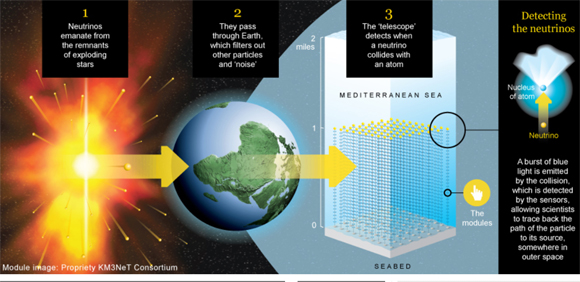 Σύμφωνα με την Daily Telegraph, επιστήμονες σχεδιάσουν να τοποθετήσουν ένα τεράστιο τηλεσκόπιο δύο μίλια κάτω από την επιφάνεια της Μεσογείου, με στόχο να ανακαλύψουν νέα μυστικά το σύμπαντος.