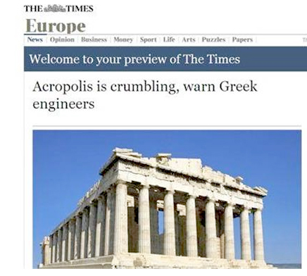 «Η Ακρόπολη καταρρέει και θα χρειαστεί δουλειά για να επισκευαστεί, προειδοποίησαν αρχαιολόγοι στην Ελλάδα. Οι μηχανικοί ανακάλυψαν ότι μέρος του τεράστιου βράχου πάνω στον οποίο δεσπόζει ο Παρθενώνας στο κέντρο της Αθήνας αρχίζει να υποχωρεί. Τα κλιμάκια του Κεντρικού Αρχαιολογικού Συμβουλίου διαπίστωσαν αστάθεια σε μια αρκετά ευρεία περιοχή, εξετάζοντας την πτώση βράχων τον Ιανουάριο, όταν ένας ογκόλιθος υποχώρησε από τον χώρο με τη μεγαλύτερη ροή επισκεπτών στην ελληνική πρωτεύουσα» επισημαίνει ο αρθρογράφος.