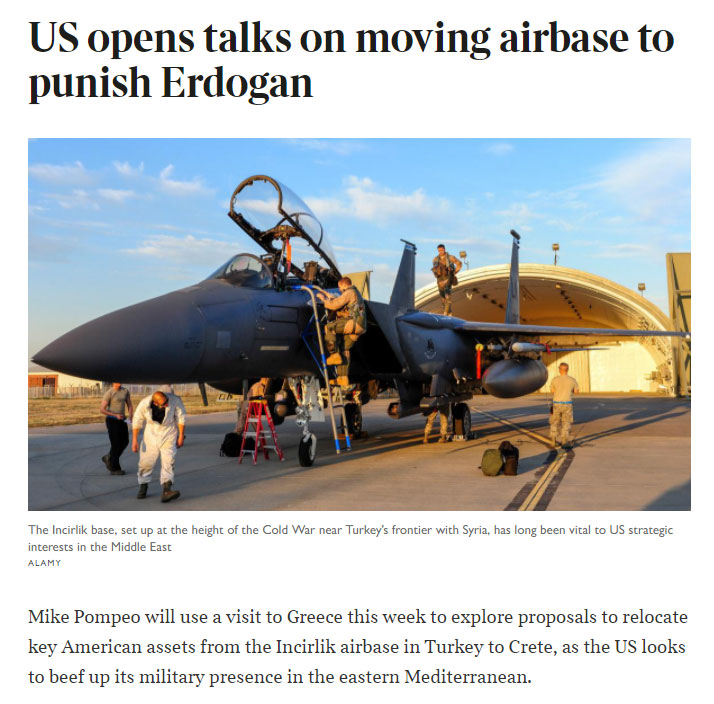 Οι ΗΠΑ άνοιξαν συνομιλίες με την Ελλάδα για τη μετεγκατάσταση της αεροπορικής βάσης του Ιντσιρλίκ προκειμένου να τιμωρήσουν τον Ερντογάν, αναφέρει χαρακτηριστικά η βρετανική εφημερίδα.