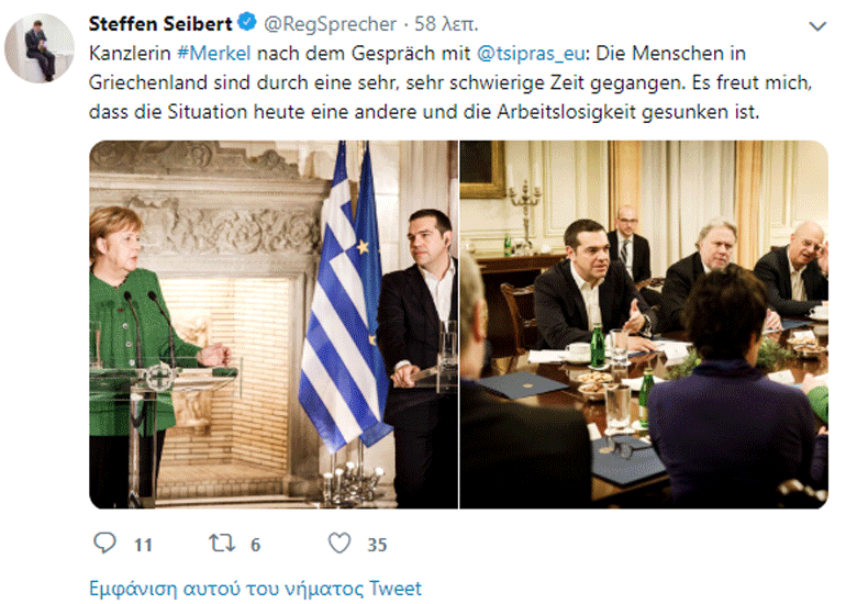 Ο κυβερνητικός εκπρόσωπος της Γερμανίας, Στέφεν Ζάιμπερτ, προβάλει με αναρτήσεις του στα κοινωνικά δίκτυα, τις δηλώσεις της καγκελαρίου Α. Μέρκελ στην Αθήνα για την μείωση της ανεργίας και το ονοματολογικό.