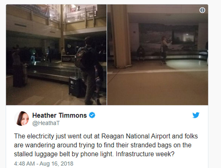 Το αεροδρόμιο Ρόναλντ Ρίγκαν της Ουάσινγκτον ανακοίνωσε χθες το βράδυ στο Twitter ότι αντιμετωπίζει μια ευρεία διακοπή ρεύματος, αλλά οι πτήσεις εκτελούνται κανονικά, παρά τις καθυστερήσεις που υπάρχουν.