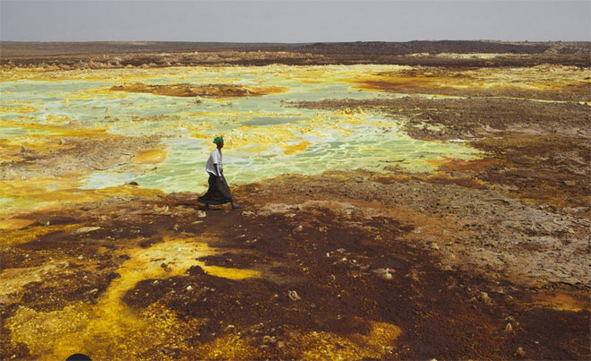 Ένας άνδρας περπατά σε θείο και σχηματισμούς ορυκτού αλατιού κοντά στο Dallol, στο Βύθισμα του Ντανακίλ, Βόρεια Αιθιοπία, 22 Απριλίου, 2013.