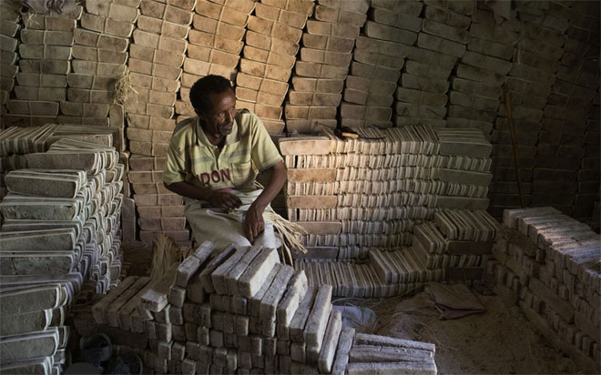 Εργάτης ετοιμάζει τις πλάκες αλατιού για πώληση στην κεντρική αγορά της πόλης Μεκέλε, Βόρεια Αιθιοπία, 24 Απριλίου, 2013.