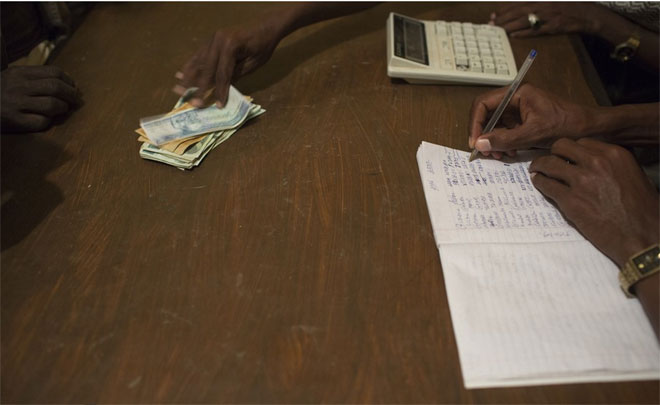 Μέλη του Συνδέσμου Αλατιού της πόλης Berahile, πληρώνουν έναν έμπορο που μετέφερε πλάκες αλατιού στην πόλη Berahile στην περιφέρεια Αφάρ, Βόρεια Αιθιοπία, 19 Απριλίου, 2013.