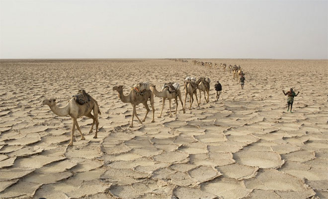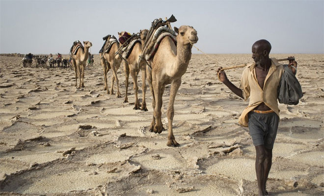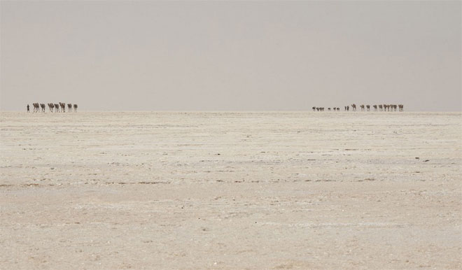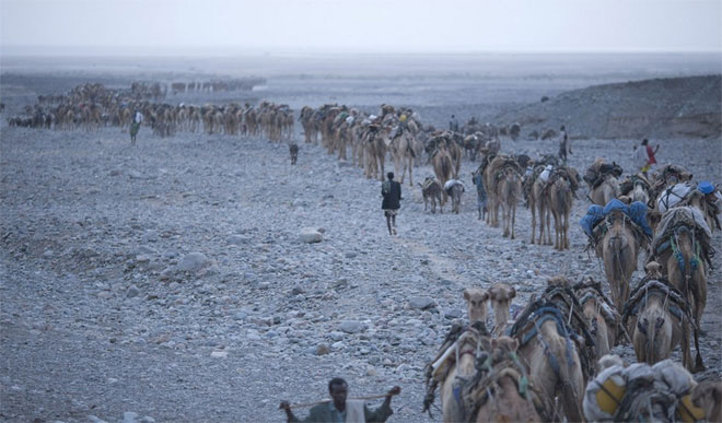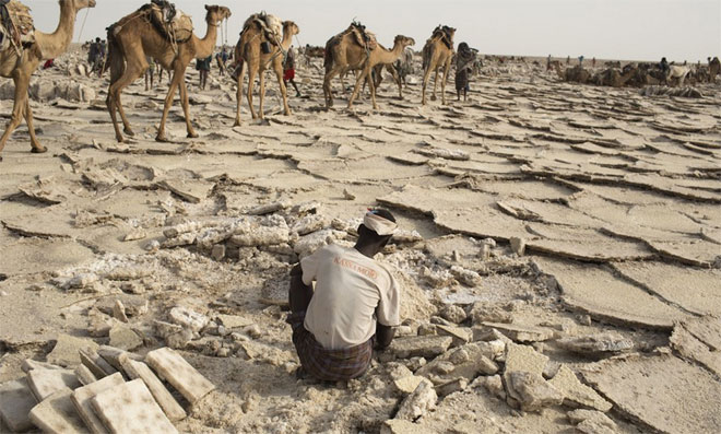 Έμποροι περπατούν με τις καμήλες τους κατά μήκος της ερήμου του Ντανακίλ, Βόρεια Αιθιοπία, 22 Απριλίου 2013. Μόλις το καραβάνι βρει ένα κατάλληλο μέρος για να αντλήσει αλάτι, σταματά, κάνει τις κατάλληλες διεργασίες, το μορφοποιεί και το συσκευάζει σε όσες περισσότερες πλάκες αλατιού μπορεί να πάρει μαζί, πριν επιστρέψει και πάλι μετά από δύο ημέρες στην πόλη Berahile όπου φυλάσσεται σε αποθήκες.