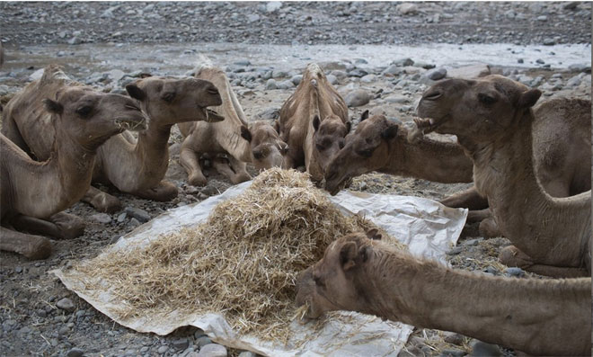 Καμήλες που ξεκουράζονται τρώγοντας ξερόχορτα στη Βόρεια Αιθιοπία, 21 Απριλίου, 2013. Σε λίγο θα ξεκινήσουν και πάλι το κουραστικό τους ταξίδι.