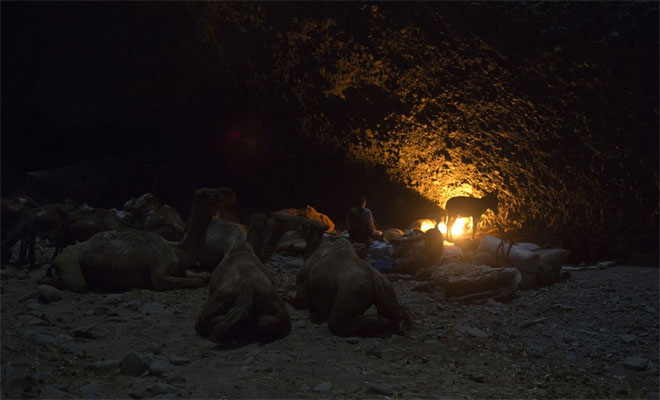 Οι έμποροι αλατιού και τα ζώα τους, ξεκουράζονται τη νύχτα σε ένα φαράγγι, σε μία στάση του ταξιδιού τους για την εξαγωγή του αλατιού από το Βύθισμα του Ντανακίλ, Βόρεια Αιθιοπία, 20 Απριλίου, 2013. Το ταξίδι στην έρημο μπορεί να διαρκέσει και εβδομάδες.