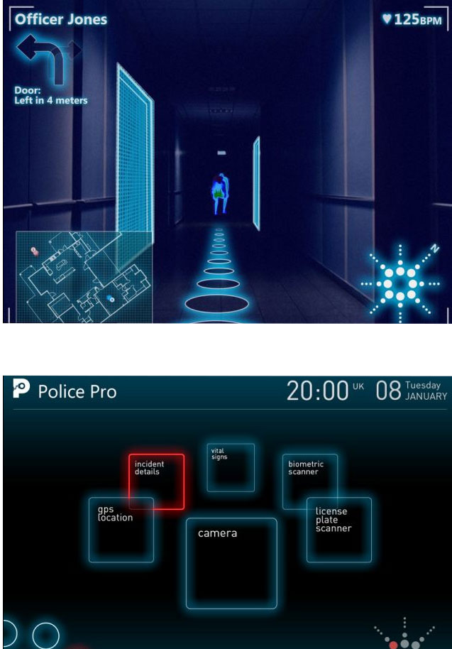 Τα γυαλιά αυτά θα έχουν λειτουργίες που θα επιτρέπουν στους αστυνομικούς την αναγνώριση των υπόπτων προσώπων, την εξερεύνηση ενός χώρου ακόμη και όταν υπάρχει μπροστά ένας τοίχος, «σκανάρει» πινακίδες οχημάτων και δίνει συντεταγμένες για διάφορες αποστολές της αστυνομίας. Επιπλέον, προσφέρει τη δυνατότητα να ανατρέξει κανείς σε χάρτες και μπορεί να λειτουργήσει σαν GPS. Τέλος, επιτρέπει και την βιντεοσκόπηση, η οποία μπορεί να γίνει αντικείμενο streaming.