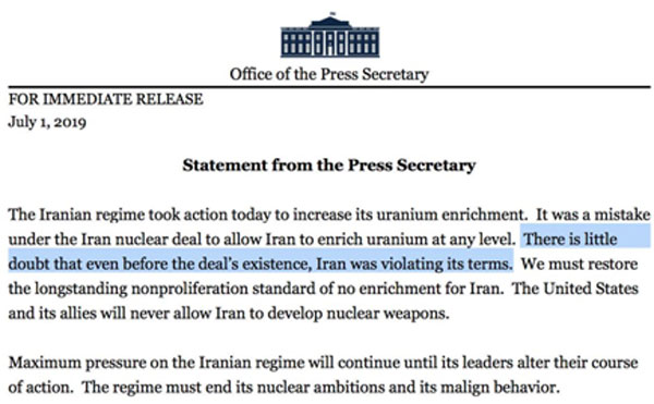 «Δεν υπάρχει αμφιβολία ότι ακόμη και πριν από την υπογραφή της [πυρηνικής] συμφωνίας, το Ιράν παραβίαζε τους όρους» δήλωσε τη Δευτέρα ο υπουργός Τύπου του Λευκού Οίκου Stephanie Grisham, καταδικάζοντας την ανακοίνωση του Ιράν ότι έχει υπερβεί τα 300 κιλά εμπλουτισμένο ουράνιο σε αποθέματα.