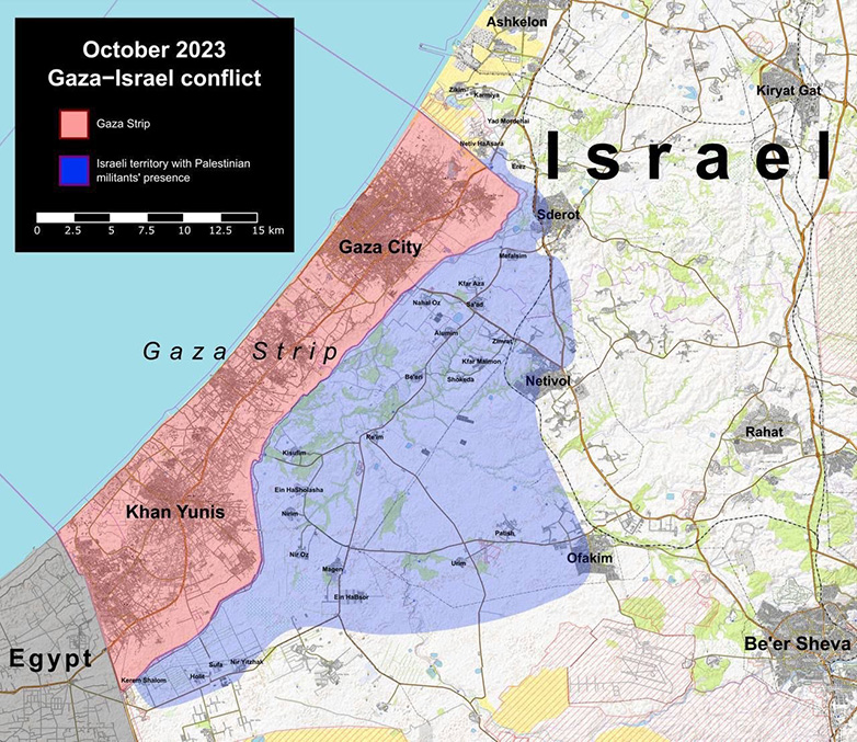 Με μπλε: Οι περιοχές του Ισραήλ που διείσδυσαν οι μαχητές των Ειδικών Δυνάμεων της Χαμάς Με κόκκινο: Η Λωρίδα της Γάζας
