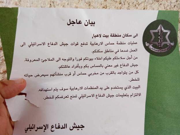 Συγκεκριμένα, το φυλλάδιο που δημοσίευσε το BBC αναφέρει πως «λόγω των ενεργειών της HAMAS, η ισραηλινή αμυντική δύναμη αναλαμβάνει δράση».