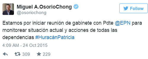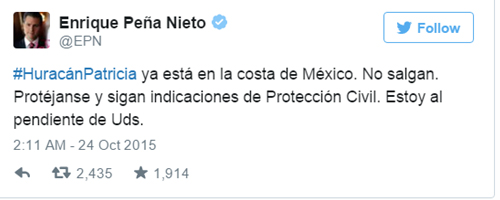 Νωρίτερα, ο πρόεδρος της χώρας κάλεσε τους πολίτες να παραμείνουν στα σπίτια τους. «Ο τυφώνας Πατρίσια είναι στην ακτή του Μεξικού. Μην βγαίνετε έξω. Προστατεύστε τους εαυτούς σας και ακολουθήστε τις οδηγίες της Πολιτικής Προστασίας. Έχω το μυαλό μου σε εσάς», το μήνυμα του Ενρίκε Πένια Νιέτο προς τους πολίτες μέσω Twitter.