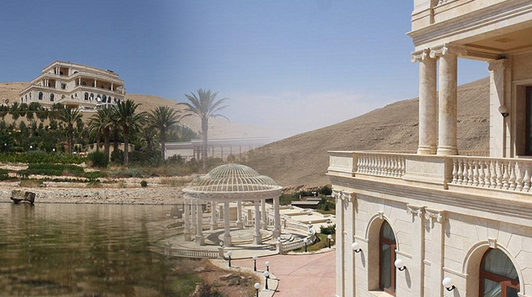 Εναέρια καρέ δείχνουν εκτεταμένους κήπους γύρω από το αρχοντικό που βρίσκεται στην καρδιά της συριακής ερήμου.