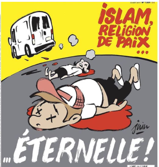 Το εξώφυλλο αναρτήθηκε στον λογαριασμό της εφημερίδας στο Facebook την Τρίτη πριν από την κυκλοφορία της εφημερίδας την Τετάρτη. Στο πρωτοσέλιδο δεσπόζει ένα σχέδιο που υπέγραψε ο σκιτσογράφος Juin όπου απεικονίζεται ένα μικρό φορτηγάκι να απομακρύνεται, αφού έχει παρασύρει και σκοτώσει πεζούς. Η λεζάντα γράφει: «ισλάμ, θρησκεία της αιώνιας… ειρήνης».