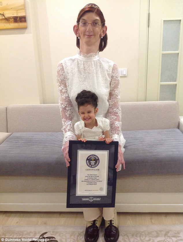Μια 17χρονη Τουρκάλα με ύψος 2.13 ανακηρύχθηκε επίσημα ως η ψηλότερη έφηβη του κόσμου από το βιβλίο των ρεκόρ Γκίνες. Το αφύσικο αυτό ύψος για την Rumeysa Gelgi προέκυψε από μια σπάνια γενετική κατάσταση που λέγεται Σύνδρομο Weaver. Η κοπέλα παρέλαβε το βραβείο της σε ειδική τελετή στην πόλη της, το Safranbolu.