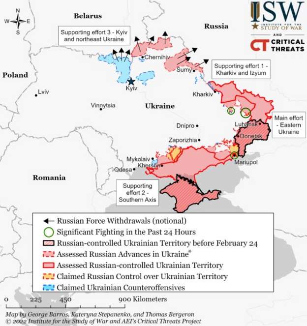 «Οι προσπάθειες των ρωσικών δυνάμεων που προχωρούν από το Ιζιούμ για την κατάληψη του Σλοβιάνσκ θα αποδειχθούν πιθανότατα η επόμενη κομβική μάχη του πολέμου στην Ουκρανία», αναφέρει, συγκεκριμένα, η έκθεση του Ινστιτούτου Μελέτης του Πολέμου.