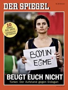 Για πρώτη φορά στην ιστορία του, το «Der Spiegel» κυκλοφορεί με το κεντρικό του θέμα γραμμένο στα Γερμανικά και στα Τουρκικά. Πρόκειται για μια «χειρονομία αλληλεγγύης» σημειώνει το γερμανικό περιοδικό «Boyun Egme». «Μη λυγίζετε» αναγράφει το πλακάτ το οποίο κρατά μία νεαρή γυναίκα στη φωτογραφία που φιλοξενεί το εξώφυλλο του «Der Spiegel». Ένα μήνυμα που απευθύνεται στους Τούρκους διαδηλωτές τόσο στην τουρκική όσο και στη γερμανική γλώσσα.