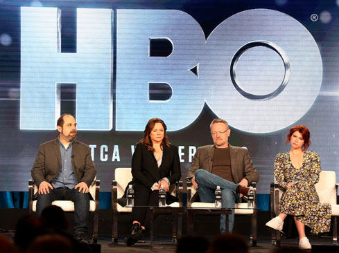Οι πρωταγωνιστές Craig Mazin, Emily Watson, Jared Harris, και Jessie Buckley (από Αρ. στα Δεξ)) του Chernobyl speak στην παρουσίαση της σειράς του HBO στην εκδήλωση της Critics Association Press Tour στην Pasadena της Καλιφόρνια.