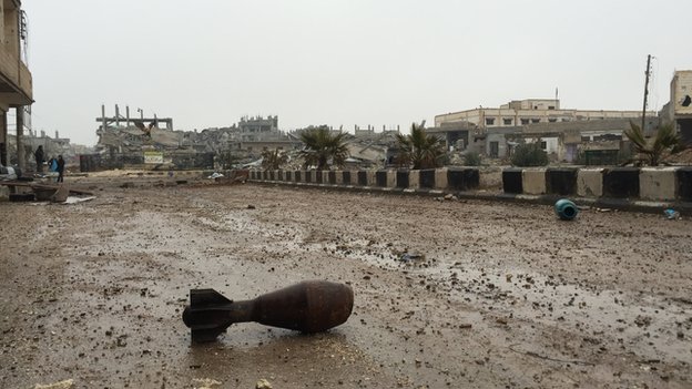 Στο οδοιπορικό του BBC διακρίνονται πτώματα να σαπίζουν στους δρόμους, μέσα σε κρατήρες που δημιούργησαν οι- απαραίτητοι για την τελική νίκη, όπως παραδέχονται όλες οι πλευρές- βομβαρδισμοί.