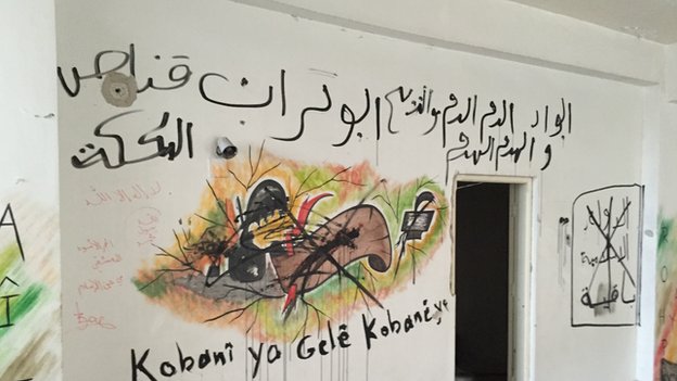 Η αγριότητα του πολέμου, το φανατικό μένος των επιτιθεμένων, καθώς και η έκβαση της μάχης, αποτυπώνονται σε ένα γκράφιτι ενός τοίχου ανατολικά της πόλης. «Αίμα, αίμα, αποκεφαλισμοί, καταστροφή», ήταν το μήνυμα ενός ελεύθερου σκοπευτή των τζιχαντιστών, που το έγραψε όταν οι δυνάμεις του Ισλαμικού Χαλιφάτου έλεγχαν την περιοχή. «Το Κομπανί είναι το νεκροταφείο του Ισλαμικού Χαλιφάτου», συμπλήρωσαν οι Κούρδοι από κάτω, όταν τους εξεδίωξαν.
