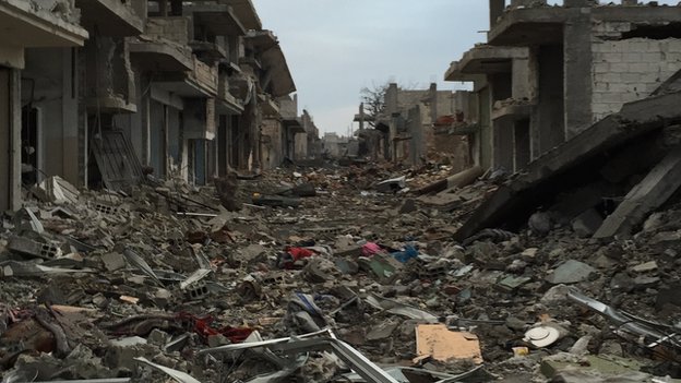Στο οδοιπορικό του BBC διακρίνονται πτώματα να σαπίζουν στους δρόμους, μέσα σε κρατήρες που δημιούργησαν οι- απαραίτητοι για την τελική νίκη, όπως παραδέχονται όλες οι πλευρές- βομβαρδισμοί.