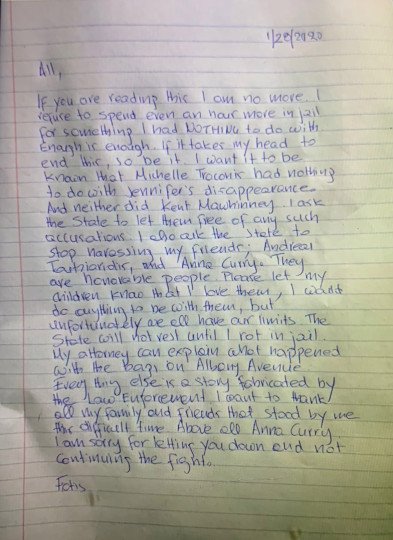 Το σημείωμα που άφησε πίσω του ήταν χειρόγραφο. Το έγραψε ο ίδιος με μπλε μελάνι σε ένα φύλλο χαρτιού και είχε ημερομηνία 28/1/2020, την ημέρα δηλαδή που βρήκε τον θάνατο στο αυτοκίνητότου, μέσα στο γκαράζ του αρχοντικού του, στο Farmington.