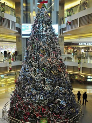 Χρησιμοποιώντας το εθνικό τους μεταφορικό μέσο ως στολίδι και κατασκευαστικό υλικό ταυτόχρονα, οι Κινέζοι δίνουν χριστουγεννιάτικο χρώμα στα εμπορικά τους κέντρα…