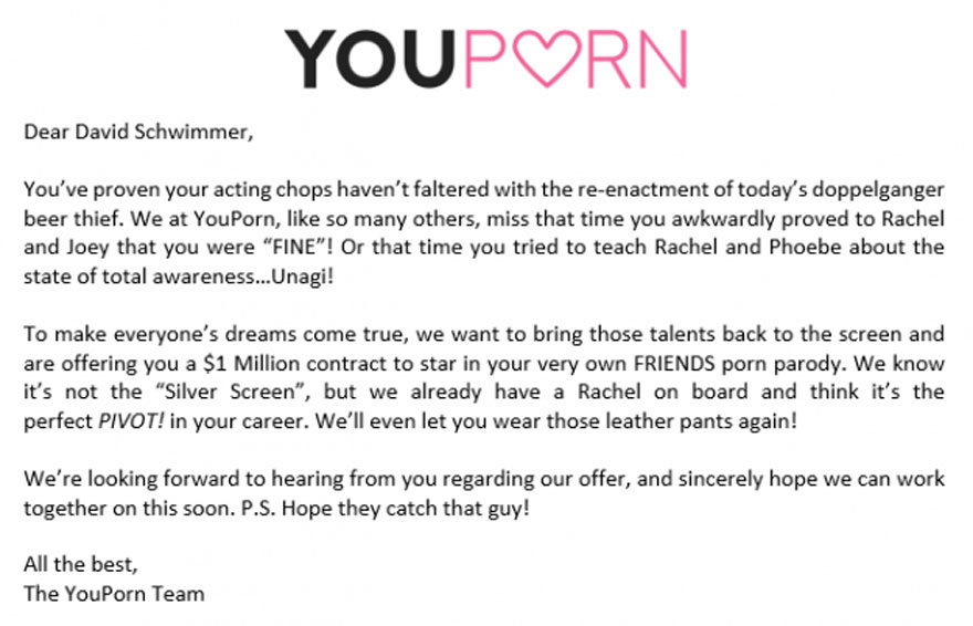 «Για να κάνουμε το όνειρο όλων πραγματικότητα, θέλουμε να δούμε τα ταλέντα σου ξανά στην οθόνη και σου προσφέρουμε συμβόλαιο ενός εκατομμυρίου δολαρίων, προκειμένου να πρωταγωνιστήσεις στη δική μας πορνό παρωδία των ”Friends”.