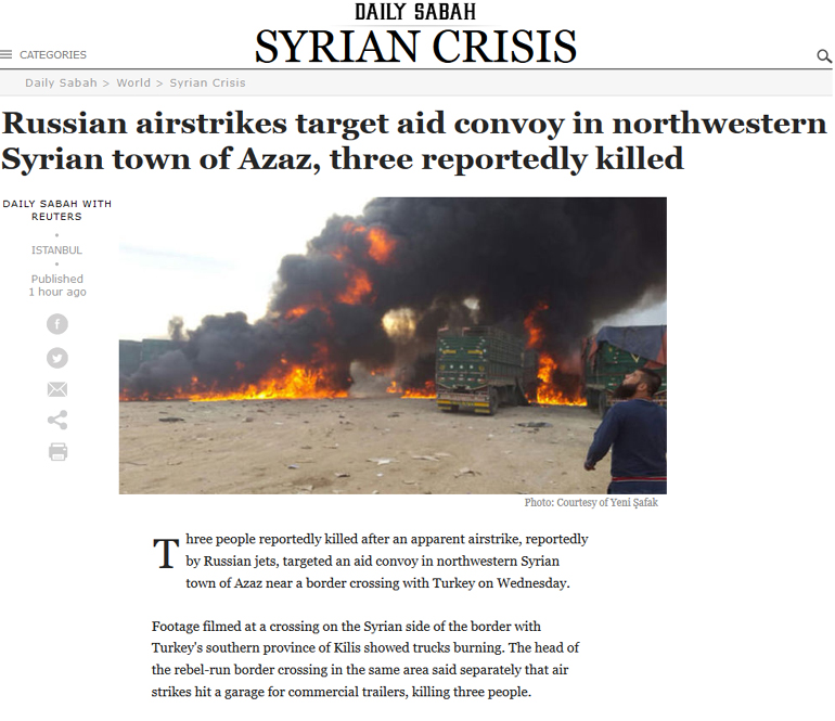 Συγκεκριμένα, ένα βίντεο που γυρίστηκε σε μια μεθοριακή διάβαση στα σύνορα της Συρίας με την επαρχία Κιλίς στη νότια Τουρκία καταγράφει φορτηγά να φλέγονται, έπειτα από μια αεροπορική επιδρομή, την οποία κατήγγειλαν εργαζόμενοι σε οργανώσεις αρωγής.