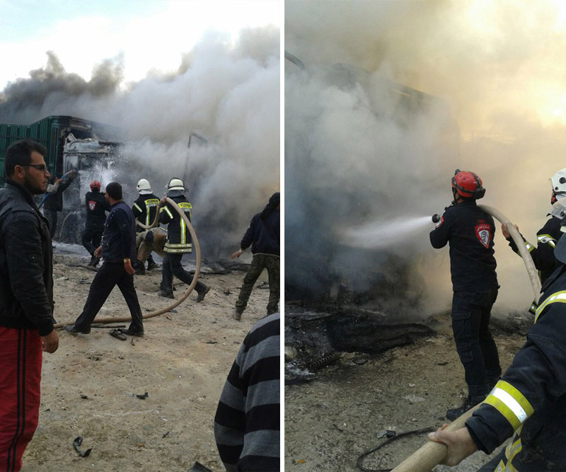 Συγκεκριμένα, ένα βίντεο που γυρίστηκε σε μια μεθοριακή διάβαση στα σύνορα της Συρίας με την επαρχία Κιλίς στη νότια Τουρκία καταγράφει φορτηγά να φλέγονται, έπειτα από μια αεροπορική επιδρομή, την οποία κατήγγειλαν εργαζόμενοι σε οργανώσεις αρωγής.