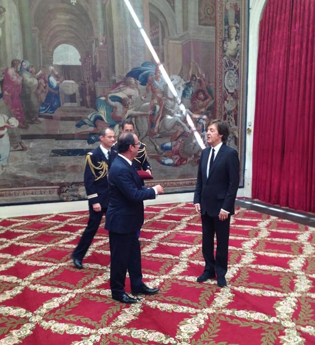 Στον λογαριασμό του στο Twitter ο McCartney δημοσιεύει τρεις φωτογραφίες του–μέσα στα σαλόνια του Μεγάρου των Ηλυσίων, και μια όπου ετοιμάζεται να λάβει την τιμητική διάκριση από τον πρόεδρο Hollande, ενώ υπάρχει και λεζάντα που γράφει «μαντέψτε πού είμαι».