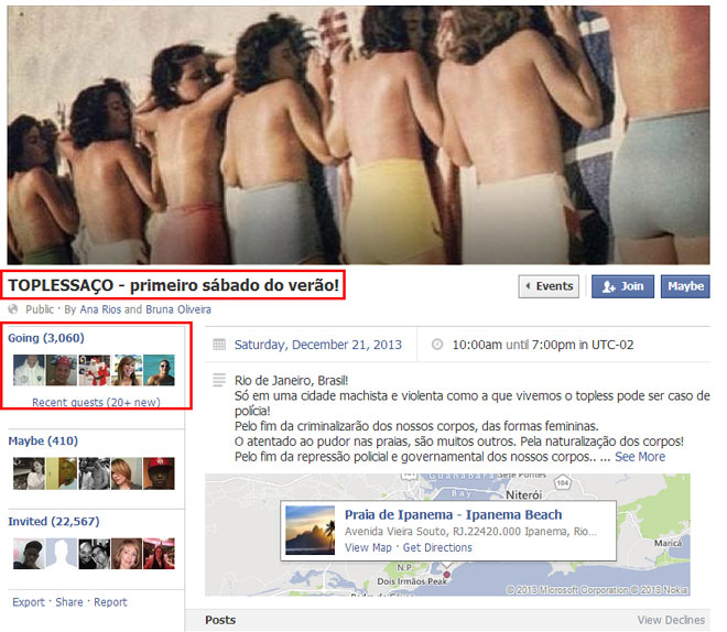 Πολλές χιλιάδες γυναίκες έχουν επιβεβαιώσει την παρουσία τους στο «Toplessaço» την 21η Δεκεμβρίου, προκειμένου να διαδηλώσουν κατά την υποκρισίας της χώρας που απαγορεύει το τόπλες στις παραλίες, αλλά επιτρέπει στις γυναίκες να παρελαύνουν γυμνόστηθες κατά το καρναβάλι στο Ρίο.