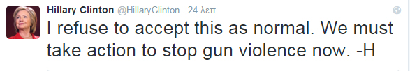 H Χίλαρι Κλίντον, πληροφορηθείσα το περιστατικό έγραψε στον προσωπικό της λογαριασμό στο twitter: «Αρνούμαι να δεχτώ το εν λόγω περιστατικό ως σύνηθες. Πρέπει να λάβουμε δράση να εμποδίσουμε την ένοπλη βία – Χ».