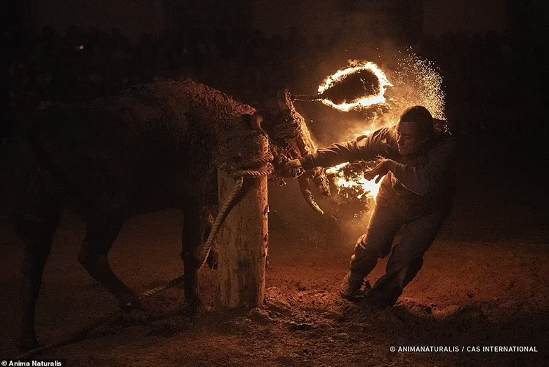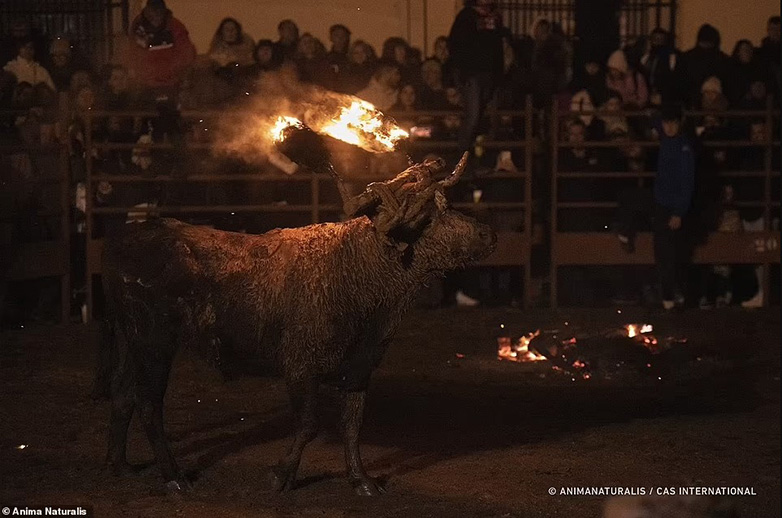 Πλάνα που καταγράφηκαν από την ομάδα προστασίας ζώων AnimaNaturalis δείχνουν μια ομάδα ανδρών να κρατά τον ταύρο καθώς προσπαθεί να απελευθερωθεί στη φετινή εκδήλωση, την Κυριακή 12 Νοεμβρίου. Οι άνδρες τραβάνε το ζώο από την ουρά, το δένουν σε έναν στύλο και βάζουν φωτιά στα κέρατά του πριν το αφήσουν ελεύθερο.