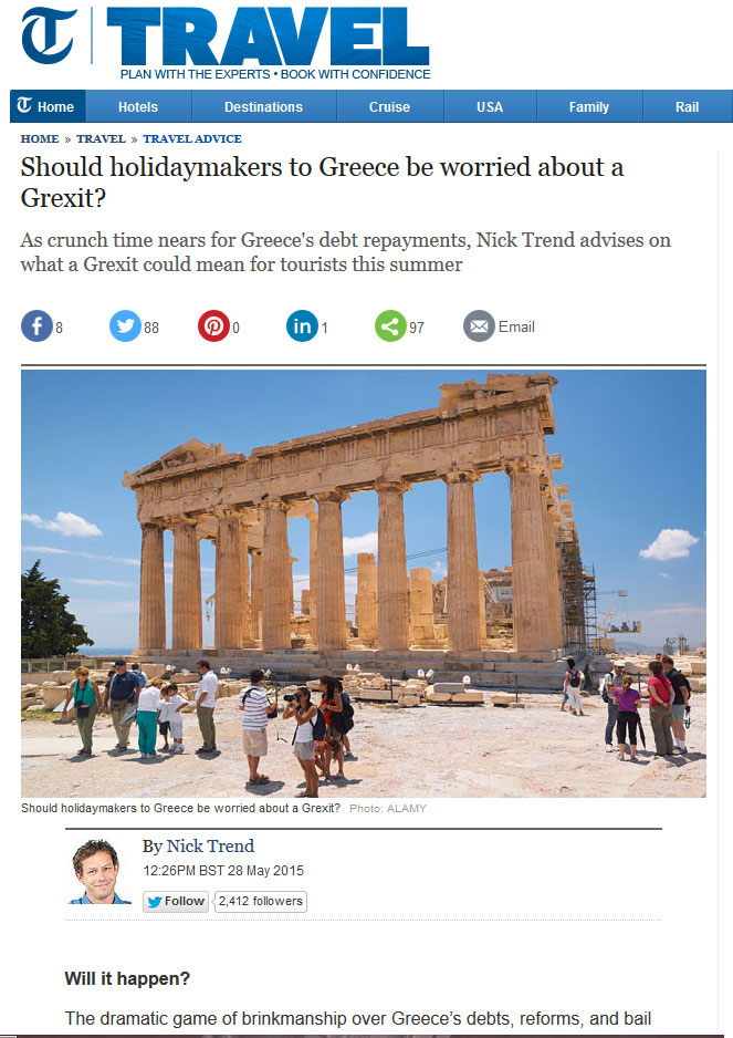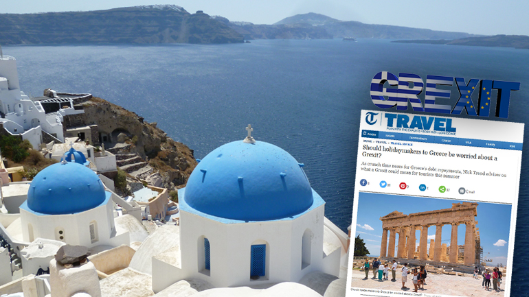 «Θα πρέπει οι τουρίστες να ανησυχούν για ένα ενδεχόμενο Grexit;» διερωτάται ο συντάκτης της Telegraph υπό μορφή οκτώ ερωτήσεων και απαντήσεωνΔεν έχει περάσει πολύς καιρός από την ημέρα που η βρετανική εφημερίδα είχε δημοσιεύσει ρεπορτάζ, σύμφωνα με το οποίο το βρετανικό υπουργείο Εξωτερικών συνιστούσε στους τουρίστες να έχουν μαζί τους αρκετά μετρητά αν αποφασίσουν να επισκεφθούν την Ελλάδα.