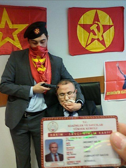 Στις εικόνες διακρίνεται ένα μέλος της οργάνωσης να έχει βάλει στον κρόταφο του εισαγγελέα Μεχμέτ Σαλίμ ένα όπλο και με το άλλο χέρι να του έχει φιμώσει το στόμα μ’ ένα μαντίλι.
