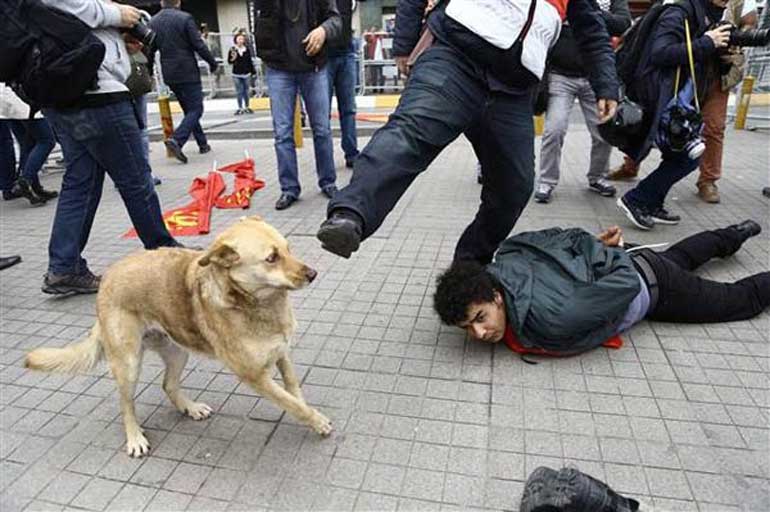 Ωστόσο η εφημερίδα Χουριέτ δημοσίευσε φωτογραφίες όπου φαίνεται ένας σκύλος να δέχεται κλωτσιές στο κεφάλι από έναν αστυνομικό, ο οποίος εκείνη την ώρα είχε προχωρήσει στη σύλληψη ενός διαδηλωτή. Μετά το περιστατικό ο σκύλος έτρεχε πίσω από ένα περιπολικό και δεν σταμάτησε να γαβγίζει.