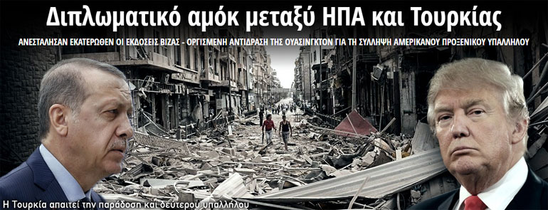 Χθες Κυριακή η αμερικανική αποστολή στην Τουρκία και η τουρκική αποστολή στην Ουάσινγκτον έπαψαν να εκδίδουν θεωρήσεις εισόδου μετά τη σύλληψη την περασμένη εβδομάδα ενός εργαζομένου στο αμερικανικό προξενείο.