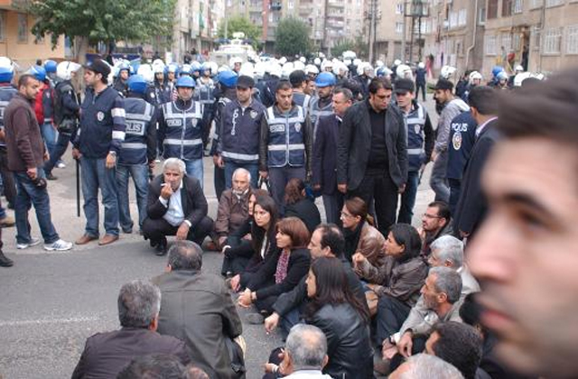 Οι βουλευτές του φιλοκουρδικού κόμματος Ειρήνης και Δικαιοσύνης και ο Κούρδος δήμαρχος της πόλης που συμμετείχαν στη συγκέντρωση, προχώρησαν σε καθιστική διαμαρτυρία μπροστά στο κτίριο της Νομαρχίας, μετά την απαγόρευση των Αρχών να μπουν στο κτίριο.