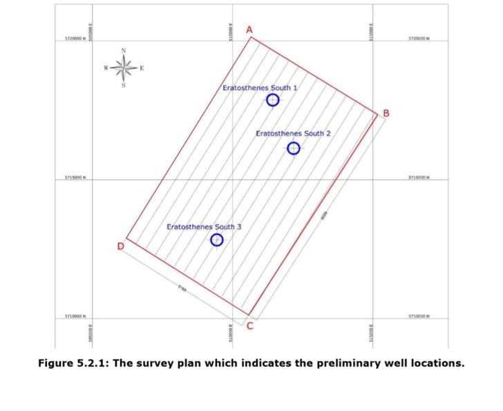 Στο τέλος του 2017 η ΕΝΙ προχώρησε και σε διαδικασίες αδειοδότησης στον εν λόγω στόχο. Πρόκειται για τον στόχο «Ερατοσθένης Νότιο» και το σημείο γεώτρησης είχε καθοριστεί το σημείο «3», ακριβώς λόγω και της διαμόρφωσης, κλίσεων κ.τ.λ. της επιφάνειας του βυθού.