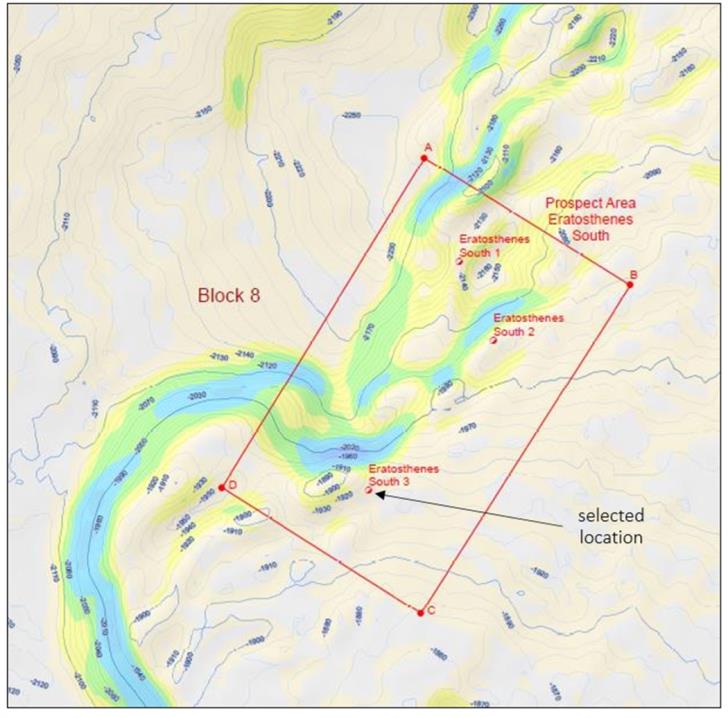 Πρόκειται για σημείο νότια του υποθαλάσσιου όρους «Ερατοσθένης» και στο άκρο του λεγόμενου περι-Ερατοσθένιου δακτυλίου. Περίπου 50 χιλιόμετρα νοτιότερα, εντός του τεμαχίου 9, η ΕΝΙ έχει πραγματοποιήσει γεώτρηση το 2015 -στον στόχο «Ονησιφόρος», χωρίς θετικό αποτέλεσμα.